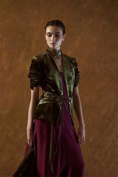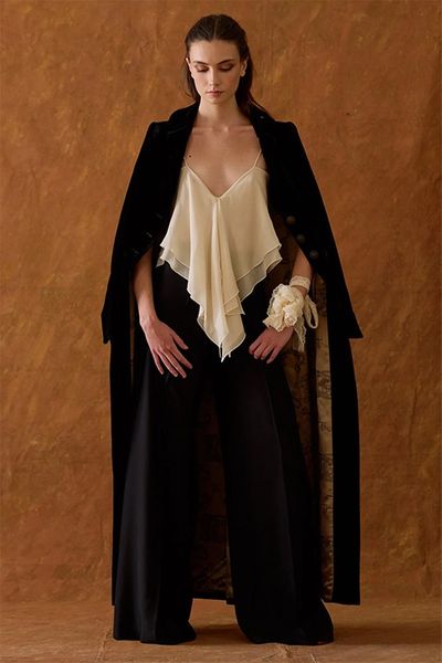 Mercedes and Sol channel that era without replicating it: intricate patterns, jewel-toned buttons, unexpected linings, vintage-inspired cuts.