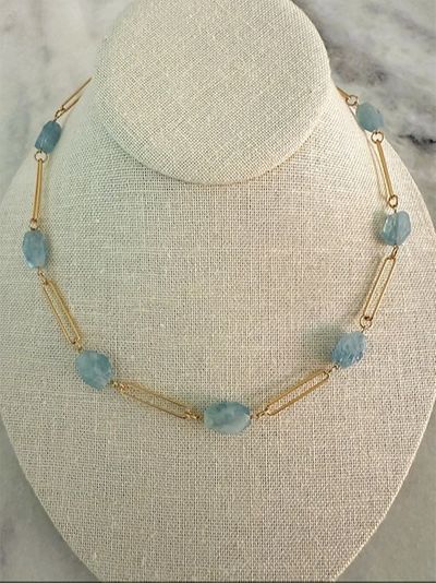 This AAA Aquamarine Nugget Paperclip Link Necklace ($225) caught our eye β genuine aquamarine gemstones linked with a gold paperclip chain, adjustable from 16β18 inches, finished with 14K gold-filled findings.
