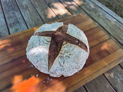 This sourdough is a boule β not a baguette. It's about a pound to a pound and a half, with a high hydration dough that stays moist and fluffy for almost two weeks in the fridge. It's complex, full-flavored, and genuinely satisfying.